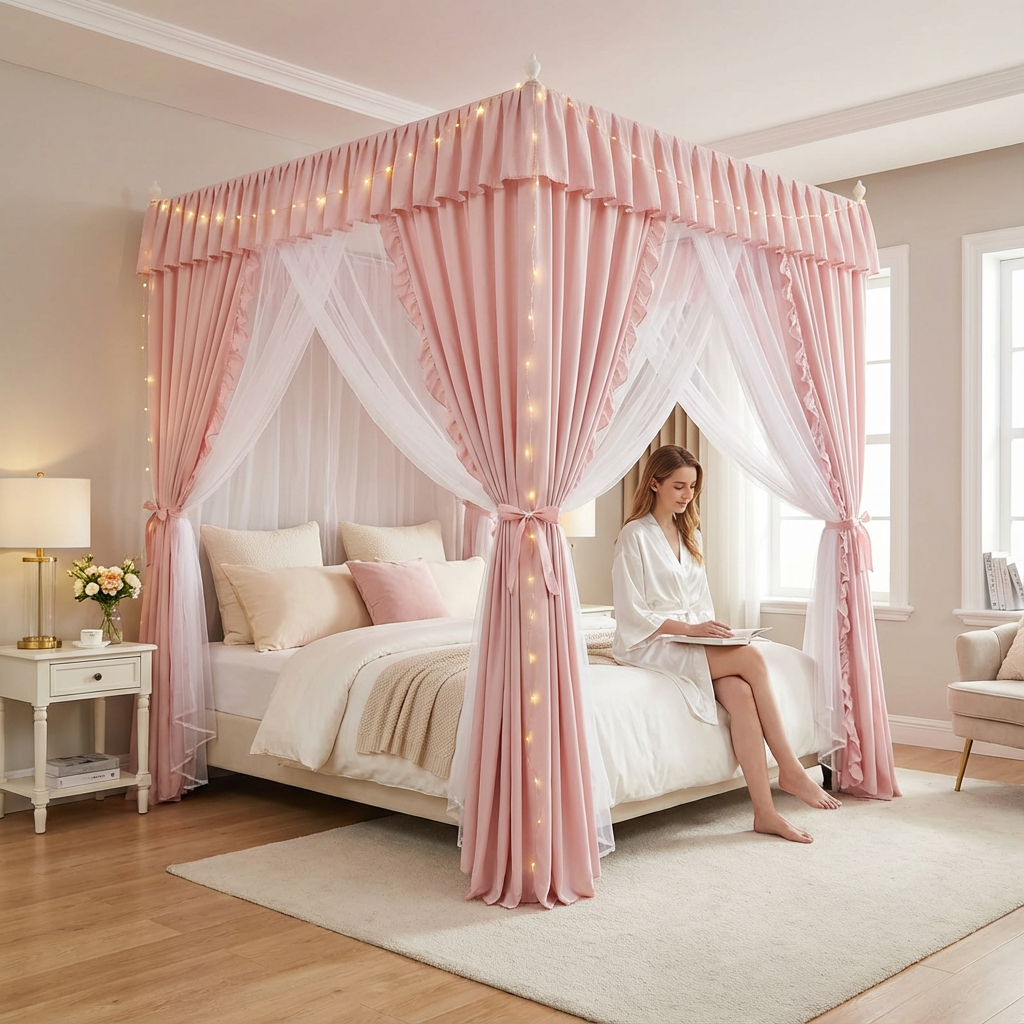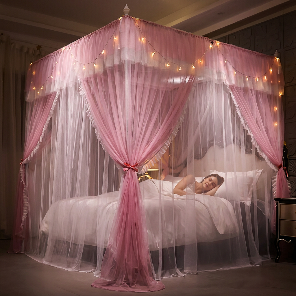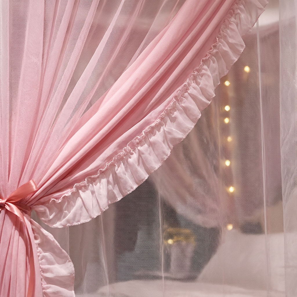 Double-layer design: pink outer curtains with ruffles + white inner mosquito net