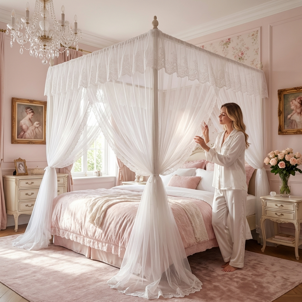 Transform your bedroom into a fairytale retreat with flowing white fabric and delicate lace detailing that cascades beautifully from ceiling to floor. The romantic princess design creates an enchanted sleeping space that feels magical every single night. This is the dreamy bedroom you've always imagined.