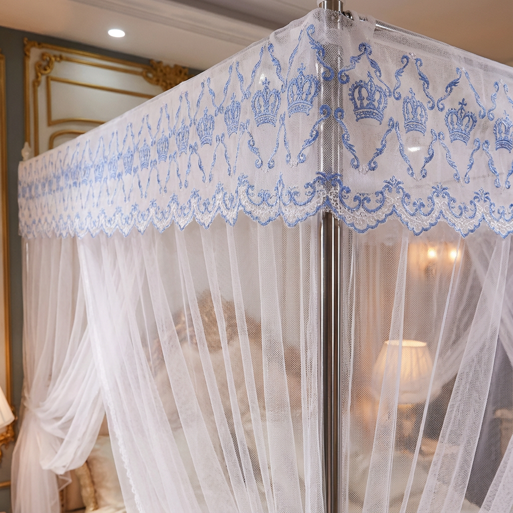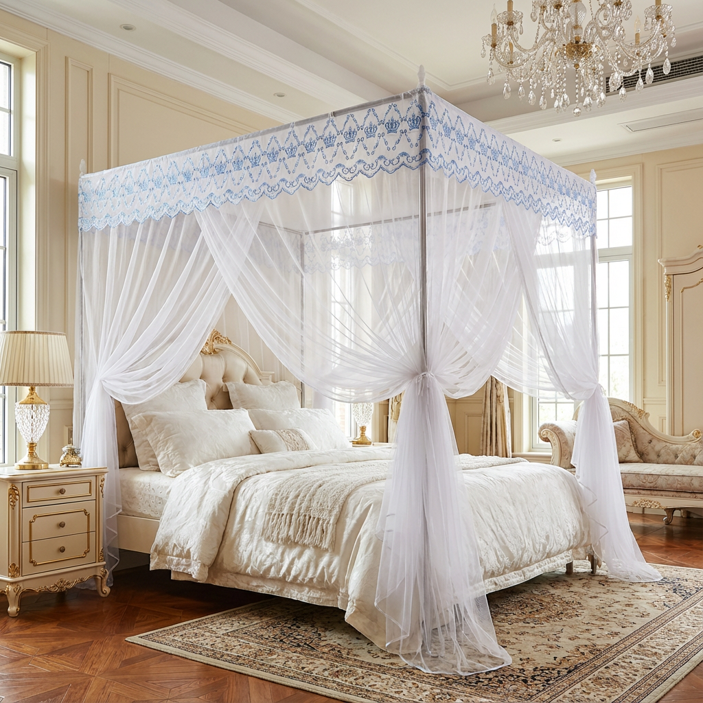 Bring the grandeur of European estates into your bedroom with ornate lace embroidery and flowing sheer curtains. The decorative canopy top features intricate patterns that transform your bed into a statement of refined luxury. This is elegance you can feel every single night.